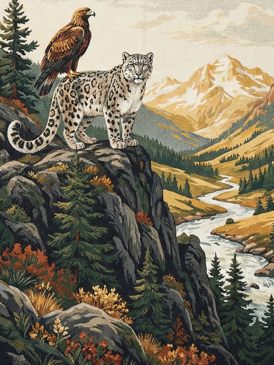 Snow Leopard & Golden Eagle Woven Cotton Blanket – Alpine Wildlife Throw Nature Lover Gifts