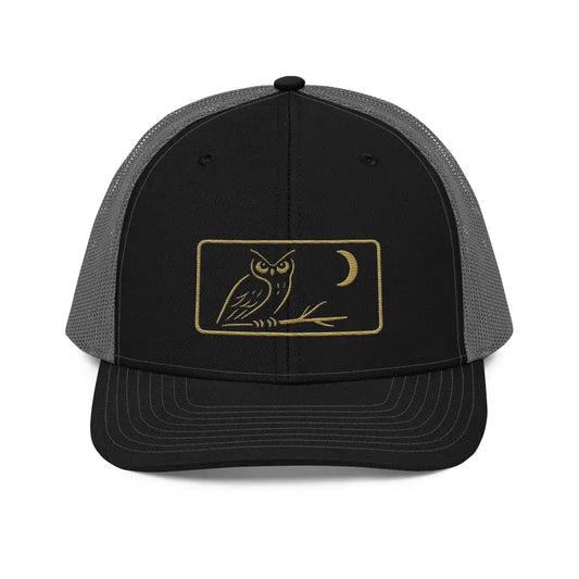 Watcher Owl Crescent Moon Embroidered Hat – Black Trucker Cap, Gothic Wildlife Heritage
